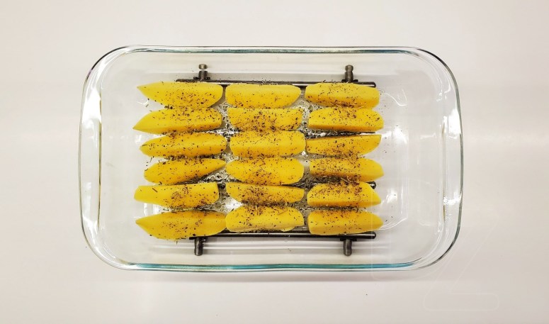 Сбрызнуть оливковым маслом, посолить, поперчить и добавить специи – любые, по желанию. Это может быть как карри с чили перцем, так и сухой укроп с солью: