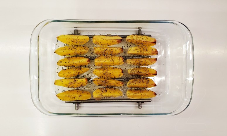 Запекать в разогретой до 170-180 °C духовке около получаса – зависит от типа духовки и сорта картошки: