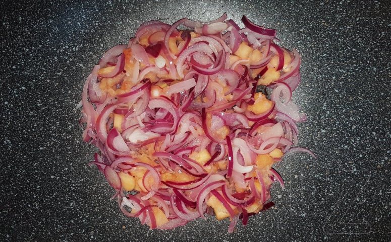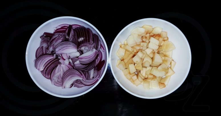 Лук нарезать полукольцами. Яблоки — небольшими кубиками: