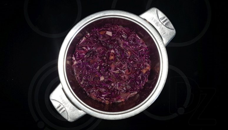 Соединить обжаренный лук с капустой и сразу влить красноe винo и двa типa уксусов, чтобы сохранился красный цвет: