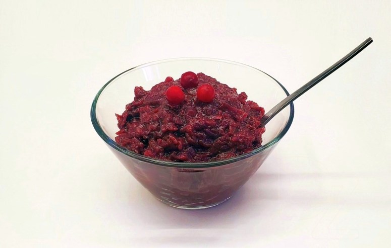 Вылить в капусту. Добавить 3 столовые ложки клюквы, томить ещё минут 5-10 на маленьком огне.