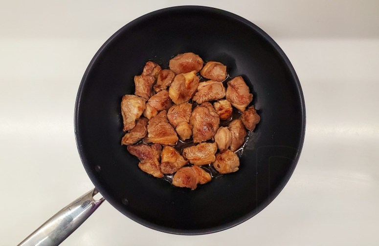 Положить мясо в казан, вок или утятницу и обжарить на сильном огне до золотистой корочки: