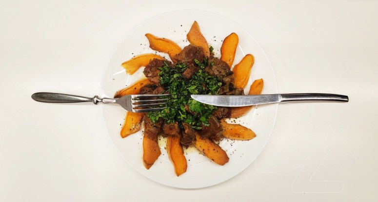 Разложить на мясе дольки айвы: