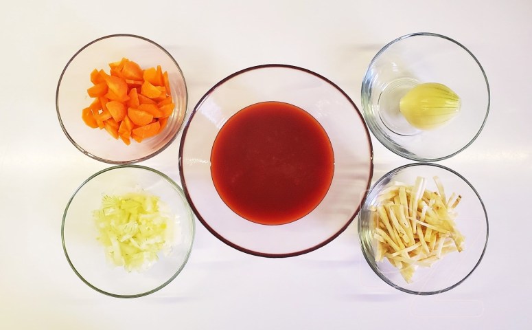 Змяшаць у рондлі таматны сок з вадой альбо булёнам.