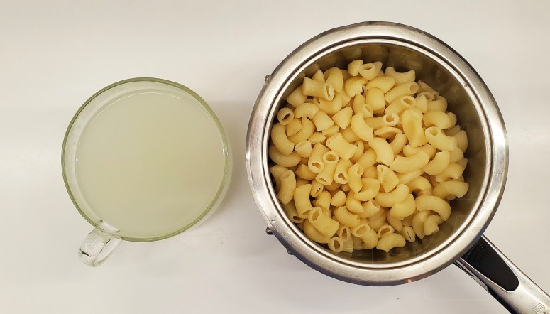 Ваду пасаліць і давесці да кіпення. Вады шмат не трэба – галоўнае, каб макароны былі пакрытыя. Вадкасць мы пасля выкарыстаем для прыгатавання соусу, і яна мае быць наварыстай.