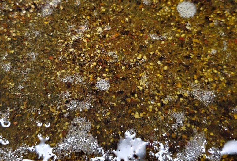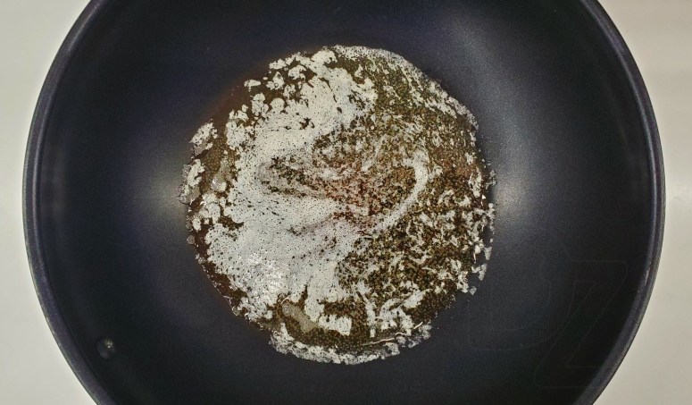 Дадаць паўшклянкі (можна нават менш) падрыхтаванай вады з-пад пасты ў патэльню. Яна пачне актыўна кіпець, і тады трэба старанна перамяшаць яе з перцам: