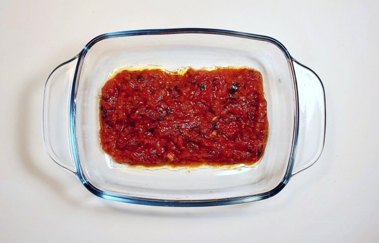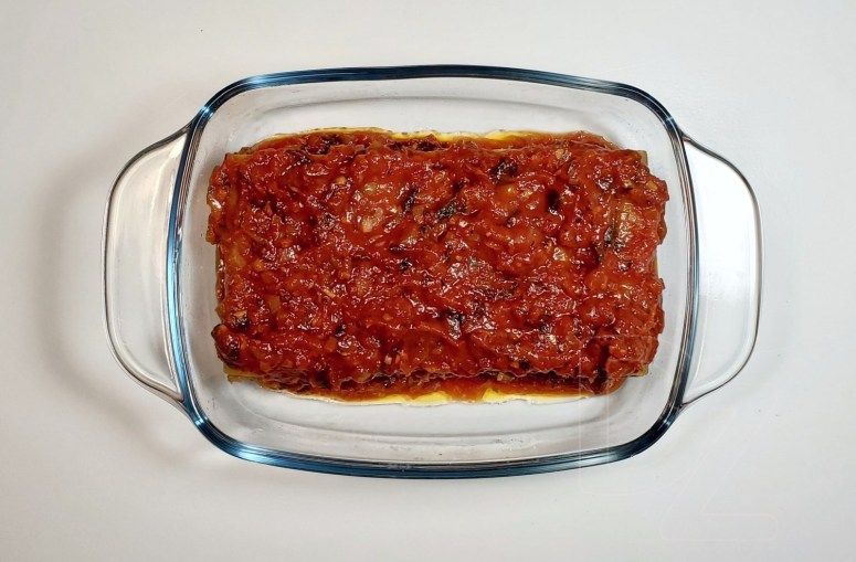 Форму для запекания сбрызнуть растительным маслом, положить слой неаполитанского соуса:
