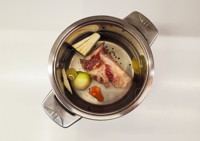 Прыгатаваць булён з дадаткам цыбулі, морквы, салеры, лаўровага ліста і чорнага перцу: