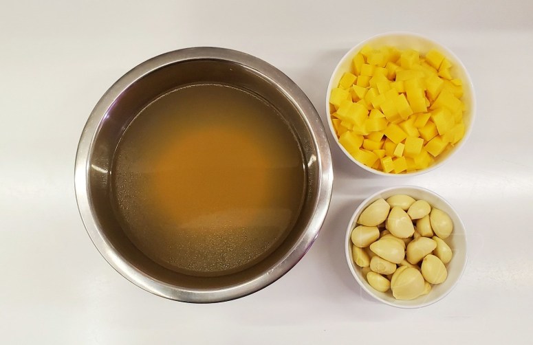 Пакласці часнок у рондаль з булёнам і гатовай бульбай, выключыць агонь.