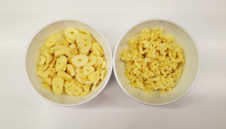 Другую палову дробна нашаткаваць альбо выціснуць пры дапамозе часночнага прэсу: