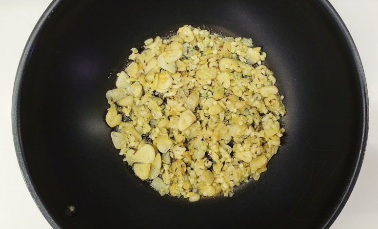 Дадаць другую частку (душаную ці дробна нашаткаваную) і абсмажыць яшчэ хвіліну. Важна не перасмажыць, інакш часнок будзе непрыемна гаркавіць: