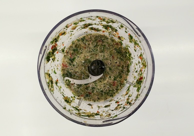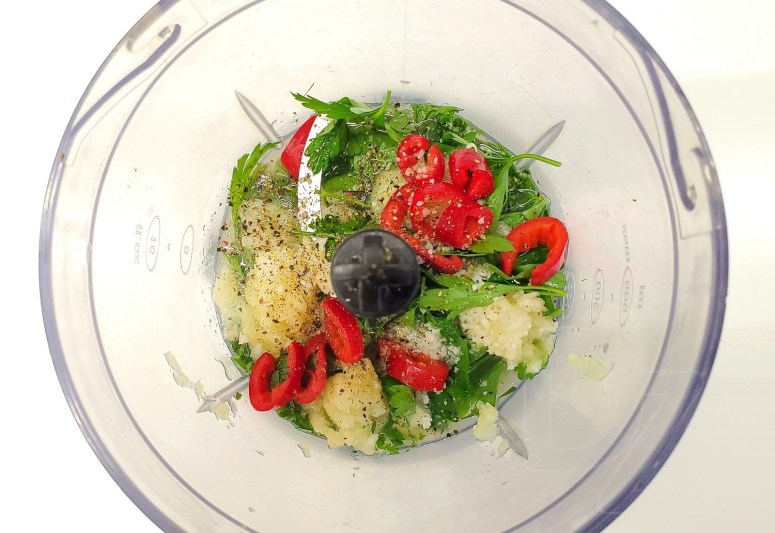 Неизмельчённую половину зелени, давленый чеснок, соль, острый и чёрный перец отправить в блендер, выдавить сок лайма: