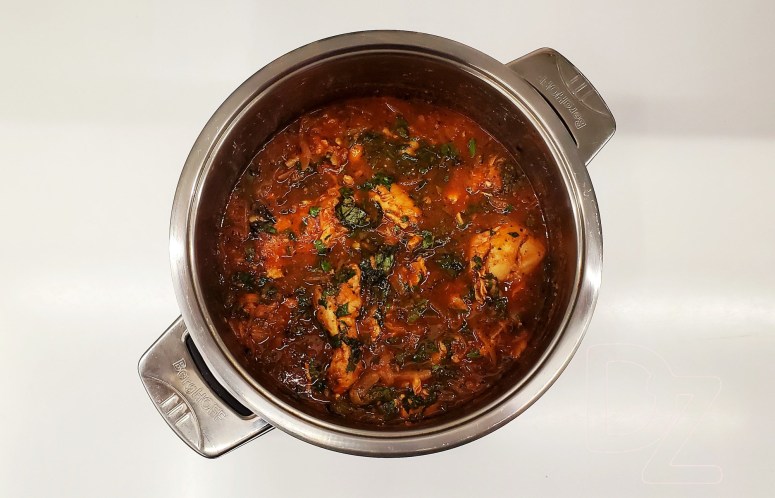 Если нужно, долить белого вина. Жидкость должна полностью покрывать курицу.