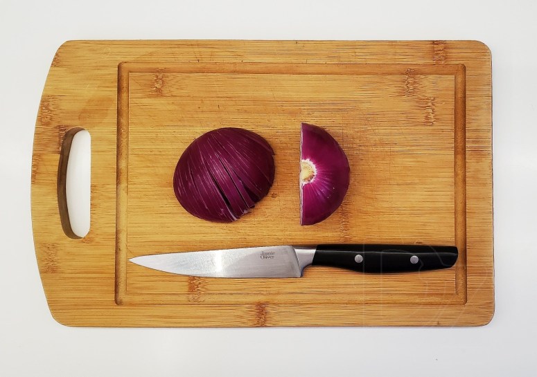 Не дорезая пару милимертров до основания (донца), нашинковать половину луковицы вдоль – перпендикулярно основанию, как можно тоньше. После всего этого половинка луковицы не должна рассыпаться: