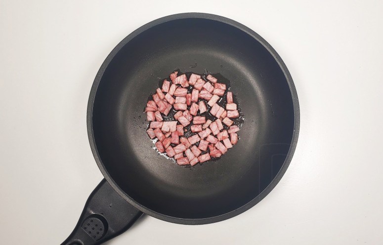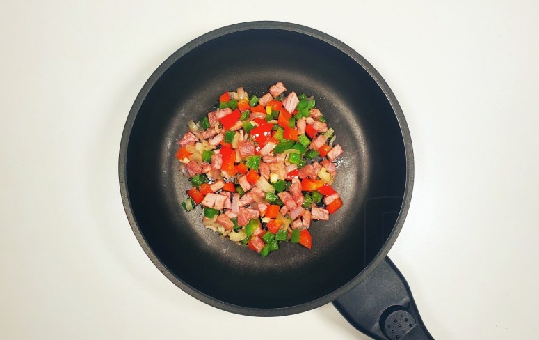 Адкласці абсмажаную гародніну з вяндлінай, працерці патэльню папяровым ручніком (усялякія перфекцыяністы (накшталт мяне😉) абавязаны, безумоўна, вымыць патэльню і выцерці насуха).