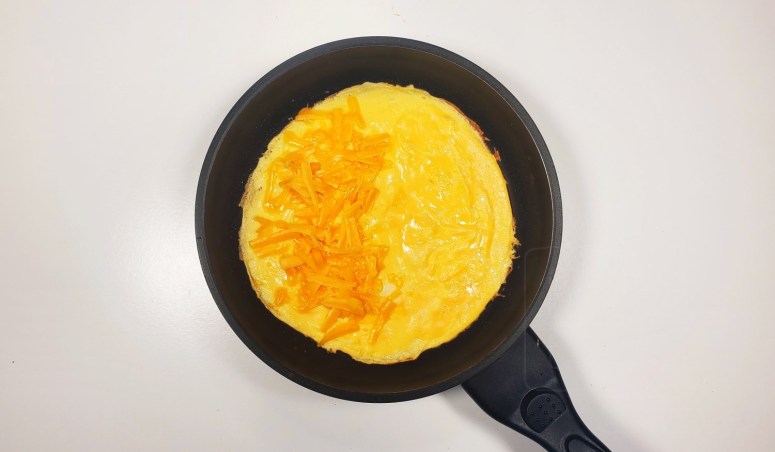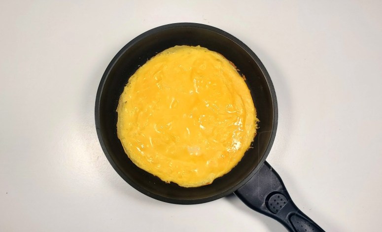 Выліць яйкі з малаком у патэльню і раўнамерна размеркаваць па паверхні.