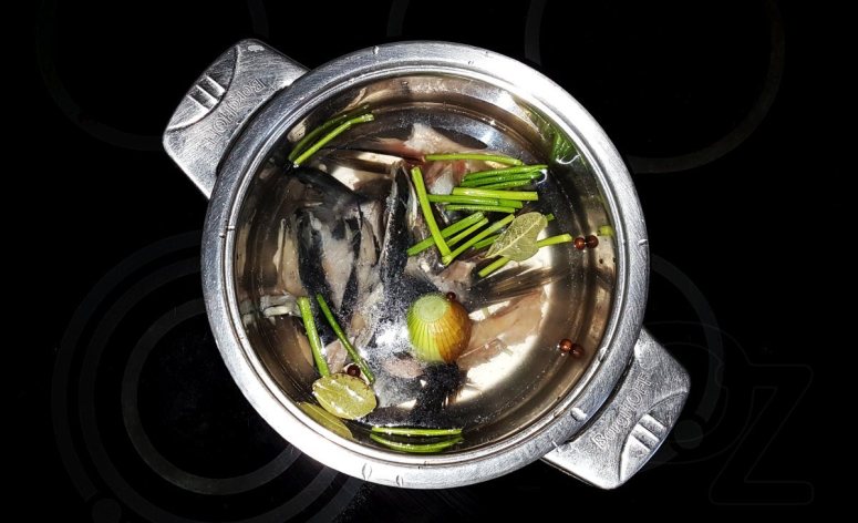 Сварить крепкий бульон с репчатым луком, лавровым листом, чёрным и английским перцем и стеблями укропа.