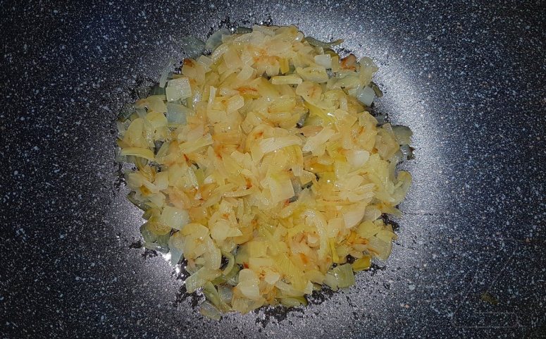 Лук мелко нарезать и пассеровать до золотистого цвета: