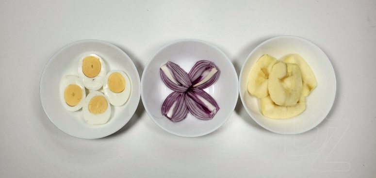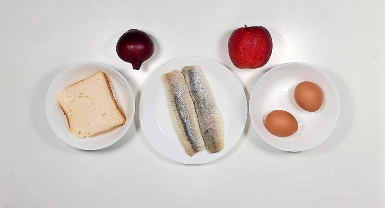 Селядзец, яечныя бялкі, яблыкі, хлеб і цыбулю пракруціць у мясарубцы тройчы.