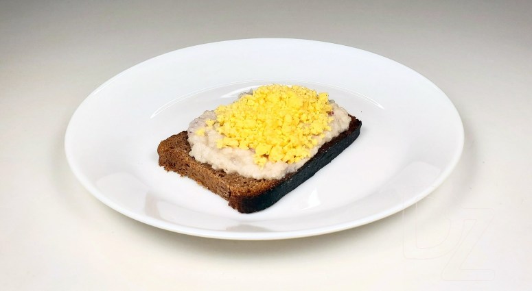 Падаваць на чорным хлебе, пасыпаўшы зялёнай цыбуляй і расцёртымі жаўткамі.