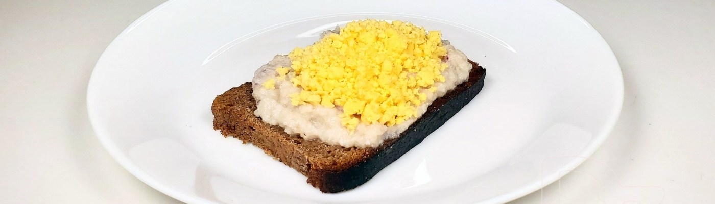 Падаваць на чорным хлебе, пасыпаўшы зялёнай цыбуляй і расцёртымі жаўткамі.