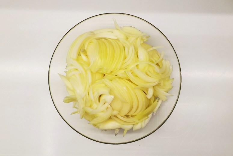 Цыбулю нарэзаць на тонкія паўколцы: