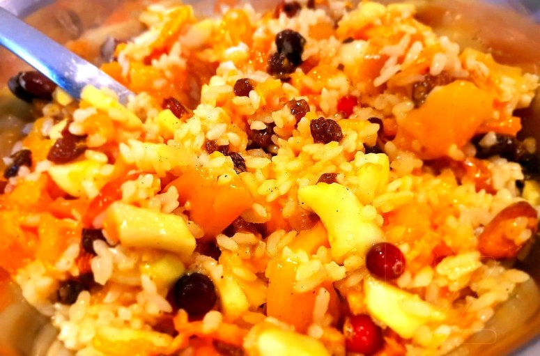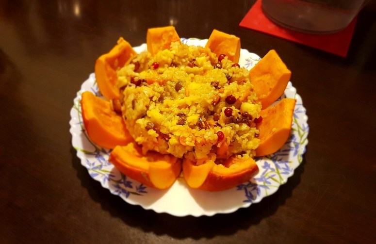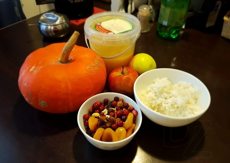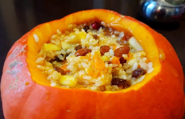 Мякаць гарбуза дробна нарэзаць, дадаць вараны рыс, разынкі, алычу, курагу, міндаль, нарэзаныя яблыкі, цукар, молатую карыцу (на кончыку нажа, бо страва можа стаць прытарнай) і старанна перамяшаць.
