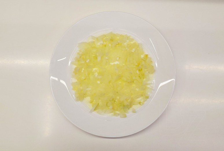 Первый слой: Мелко нарезанный репчатый лук (если слишком острый – можно предварительно ошпарить кипятком).