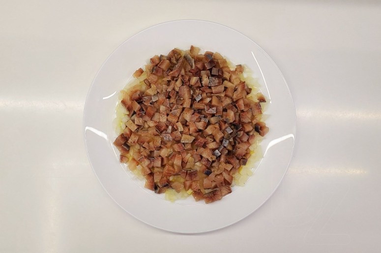 Второй слой: Нарезанное небольшими кусочками филе сельди (матиас, пряного посола и пр.).