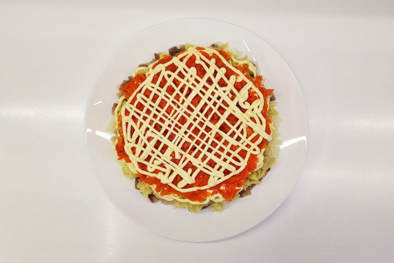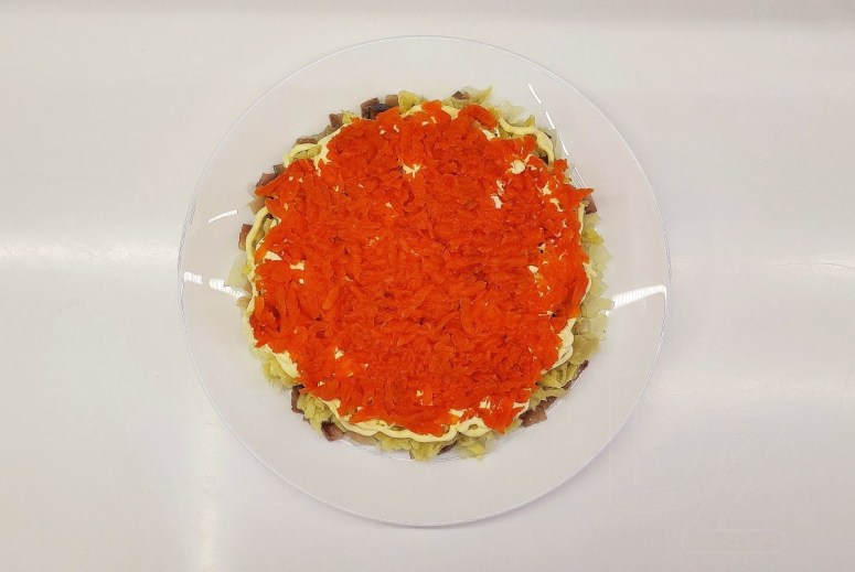 Четвёртый слой: Натёртая на крупной тёрке варёная морковка: