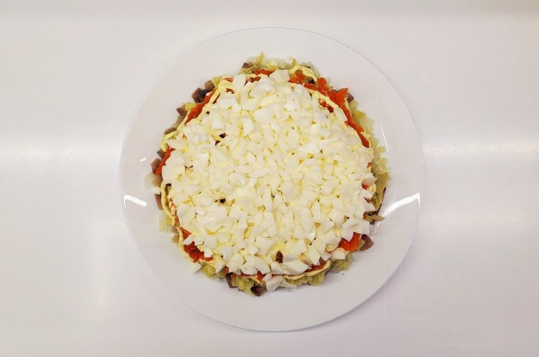 Пятый слой: Порезанные кубиками белки варёных яиц:
