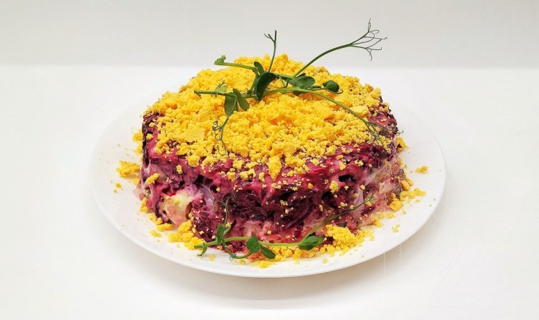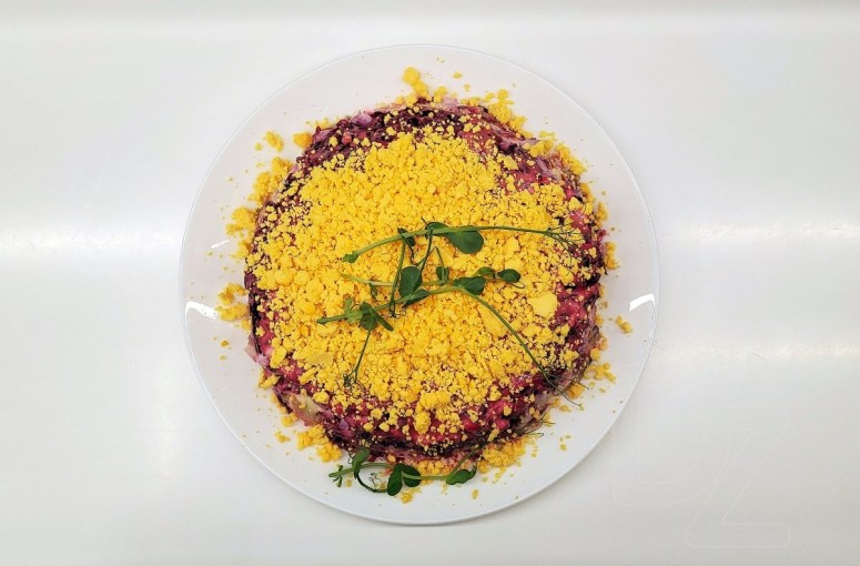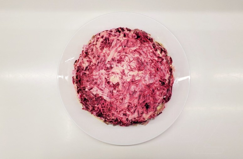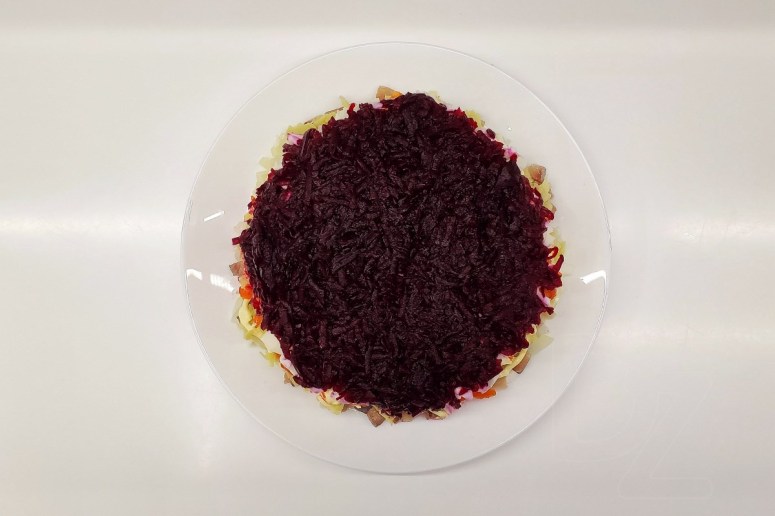 Шестой слой: Натёртая на крупной тёрке варёная свекла:
