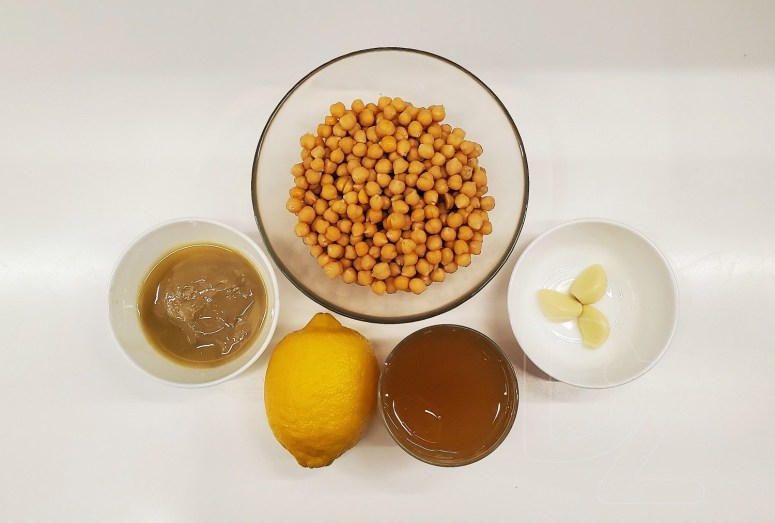 Я заўсёды выкарыстоўваю гатовую пасту тахіні (яна злева на фота ніжэй). Але калі пад рукой будзе толькі кунжут, пасту можна прыгатаваць і самому, перацершы абсмажаны ачышчаны кунжут з дадаткам кунжутнага/аліўкавага алею. Цяпер усе інгрэдыенты ў зборы: