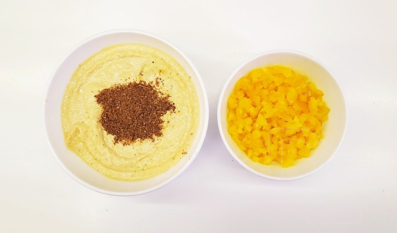Дадаць у хумус, змяшаць са спецыямі і сушанай цыбуляй: