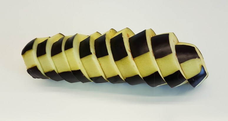Баклажан почистить зеброй (не для красоты, а чтобы лучше пропиталось) и нарезать кружочками толщиной около 1 см: