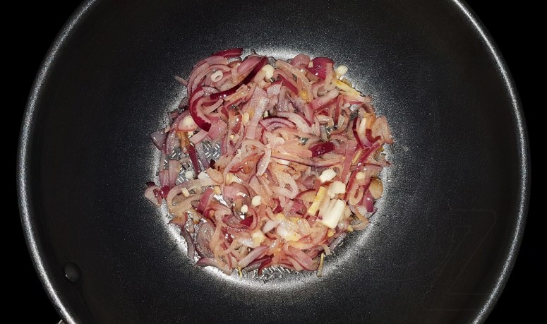Положить мелко нарубленный чеснок и обжаривать ещё около минуты: