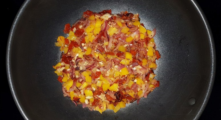 Добавить мелко нарезанный сладкий перец и вяленые помидоры, обжаривать 2-3 минуты: