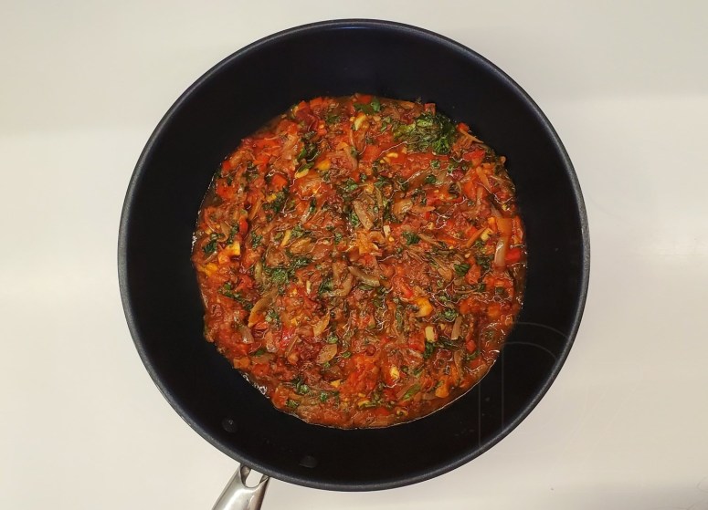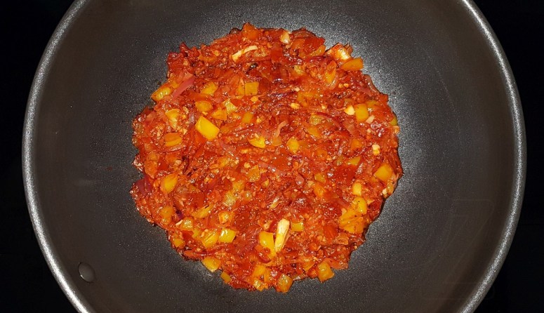 Положить томат-пасту и продолжать жарить ещё минуту: