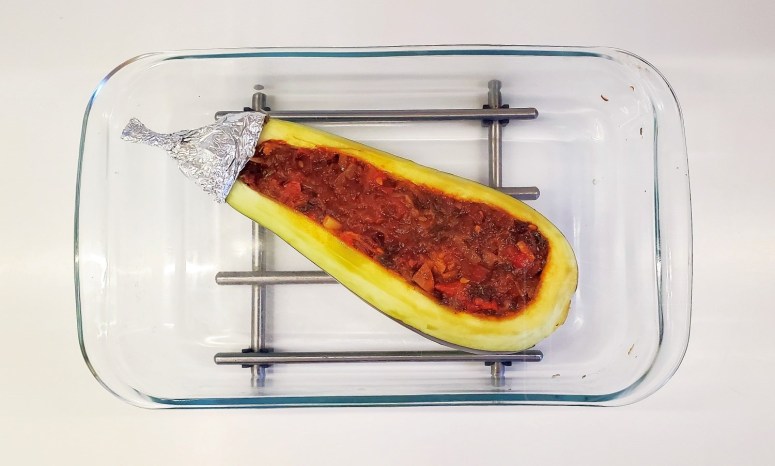 Смазать подготовленные баклажаны изнутри оливковым маслом.