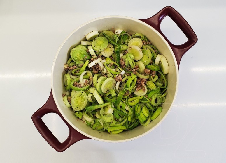 Цыбулю-парэй нарэзаць на колцы, не вельмі тонка: