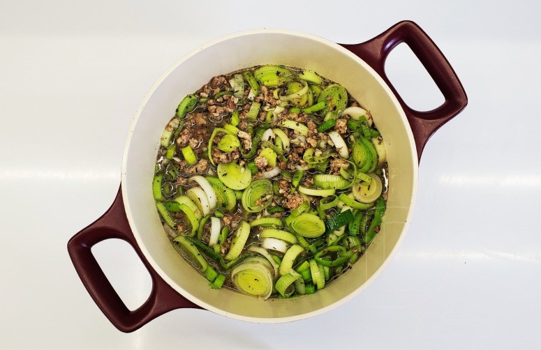Перакласці ў рондаль (калі да гэтага гатавалі не ў ім), уліць ваду альбо гароднінны булён – 1,5-2 літры.