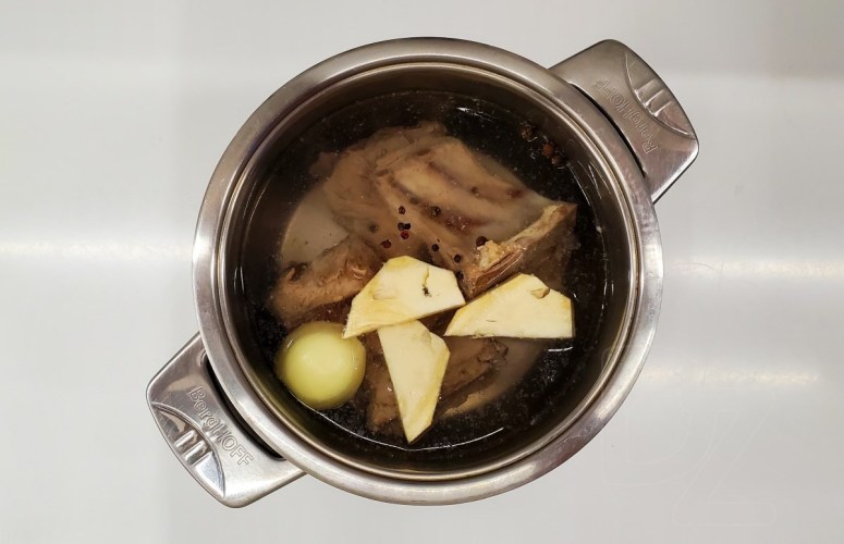 Из костей приготовить бульон с добавлением лука, сельдерея и чёрного перца:
