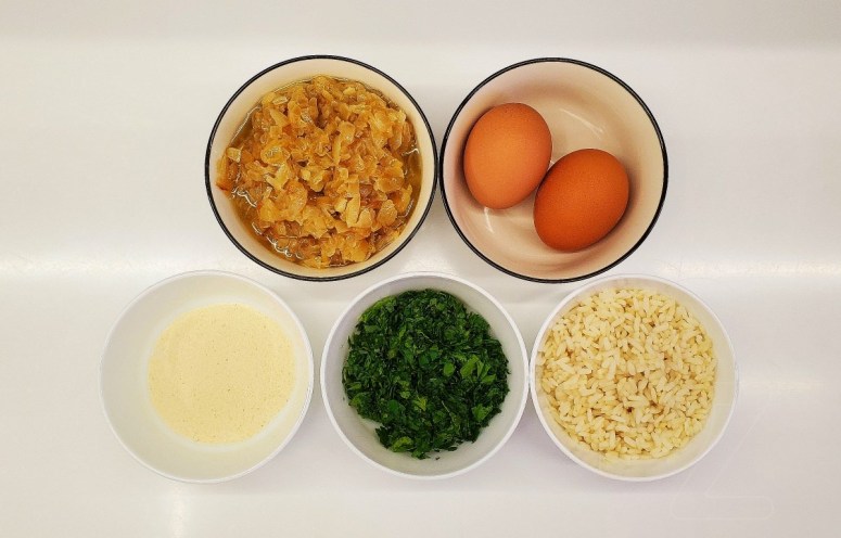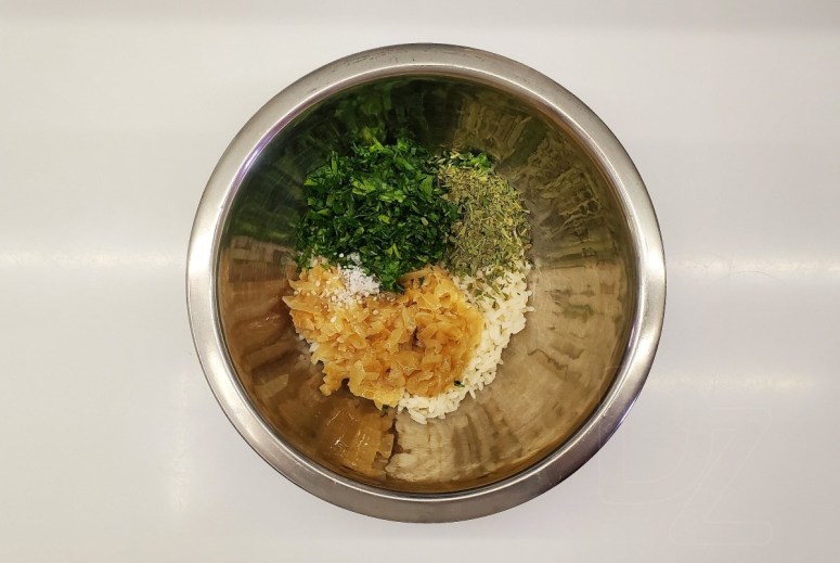 Смешать рис с половиной обжаренного лука и половиной зелени.
