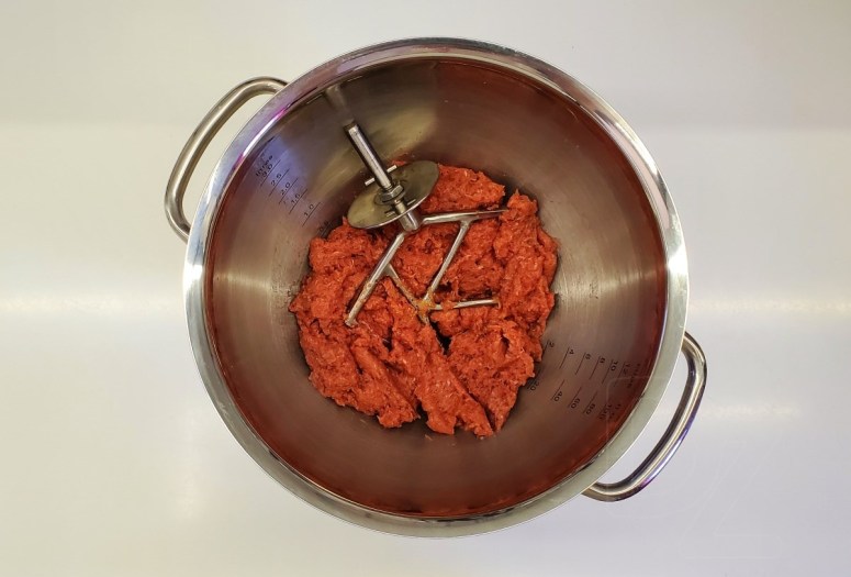 Для суповых фрикаделек обычно используют фаршеобразный кололак. Фарш сначала перемешивают, а потом немного отбивают молотком до более-менее однородной консистенции. Но для простоты можно просто взбить миксером: