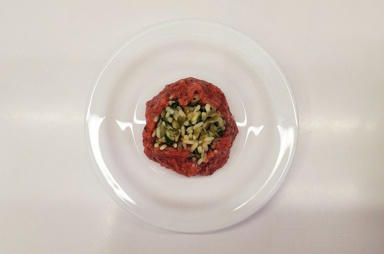 В суфлеобразном фарш сначала долго отбивают молотком, добавляя масло, молоко и коньяк, а потом взбивают до той самой суфлеобразной консистенции.