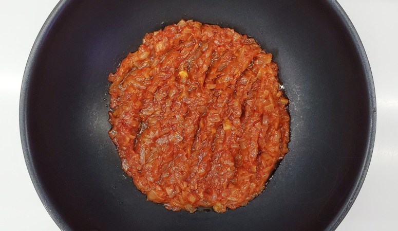 В оставшийся обжаренный лук добавить томатную пасту и слегка пассеровать: