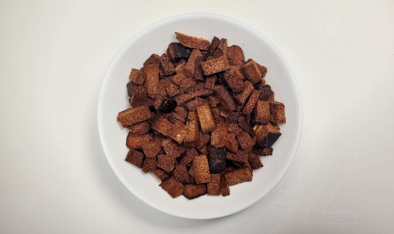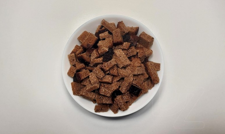 Жытнёвы хлеб (калі з каляндрай – зрэзаць скарынку) нарэзаць на брусочкі: