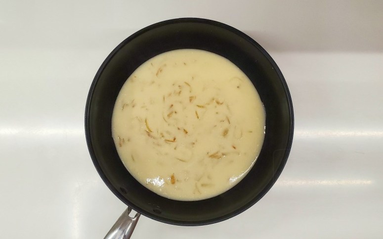 Закипятить соус и поварить минут пять, до набухания муки. В результате соус должен быть чуть более жидким, чем желаемый в результате – ведь жидкость будет ещё испаряться во время тушения с мясом: