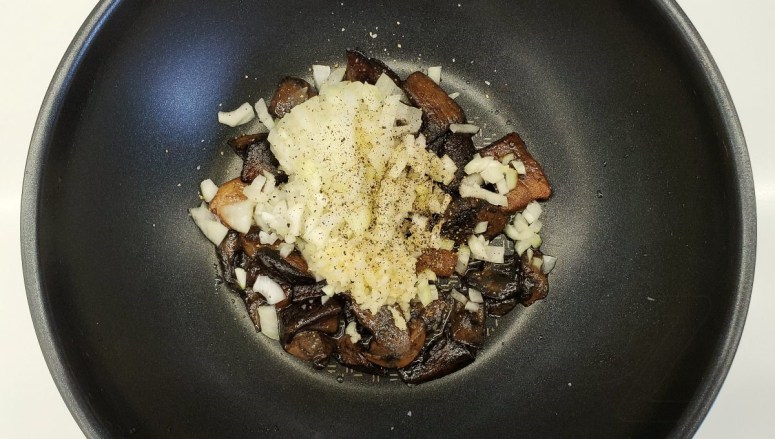 Добавить мелко нарезанный лук и давленый чеснок, плюс соль и перец: