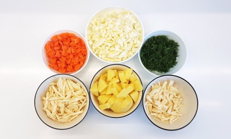 Картошку и морковку нарезать кубиками, корень петрушки и/или сельдерея – соломкой: